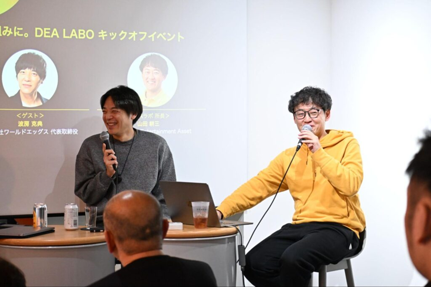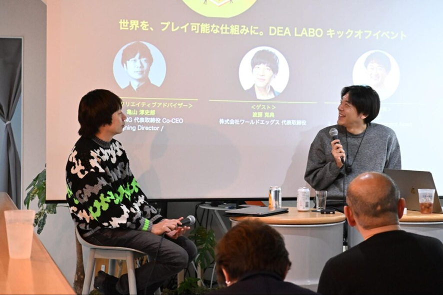 本イベントは、「DEAラボ所長」である、DEA代表取締役社長の山田耕三氏を中心に、「DEAラボ クリエイティブアドバイザー」の株式会社SIGNING 亀山淳史郎氏とともに、株式会社ワールドエッグス 波房克典氏をゲストに迎え、「ゲーミフィケーションのその先」にある社会設計の可能性について語り合いました。